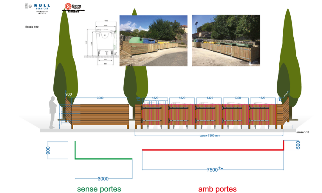 La actuación consistió en la instalación de un cerramiento visual (también conocido como pantalla o envolvente estética) para ocultar los contenedores de reciclaje (vidrio, papel y resto) presentes en la zona.