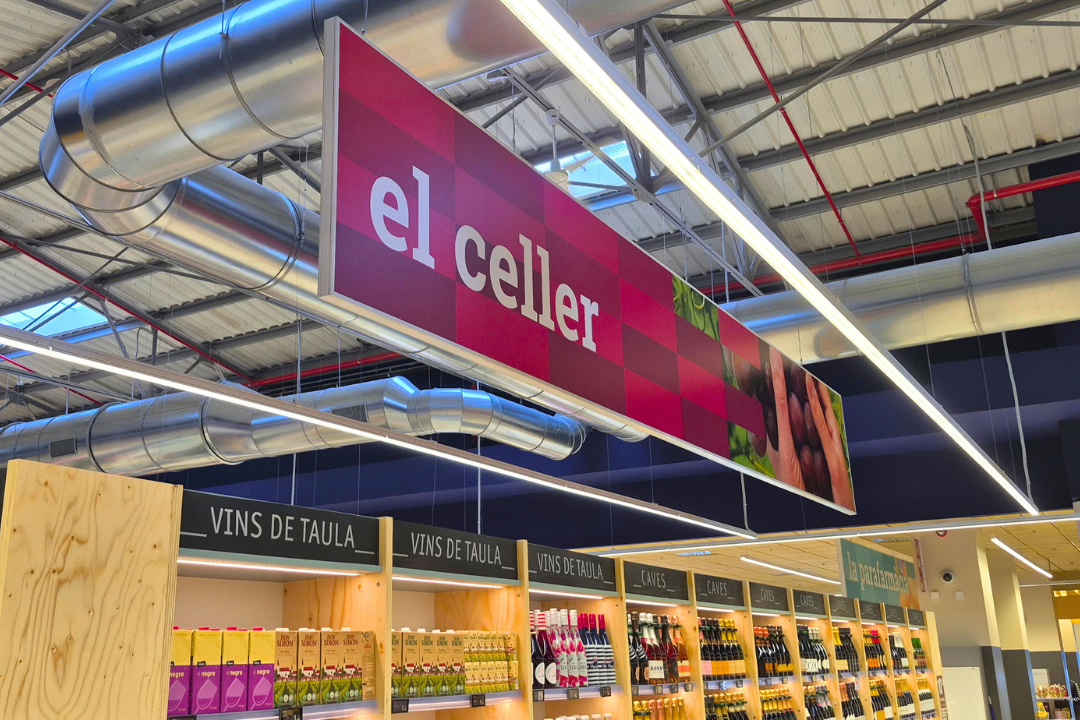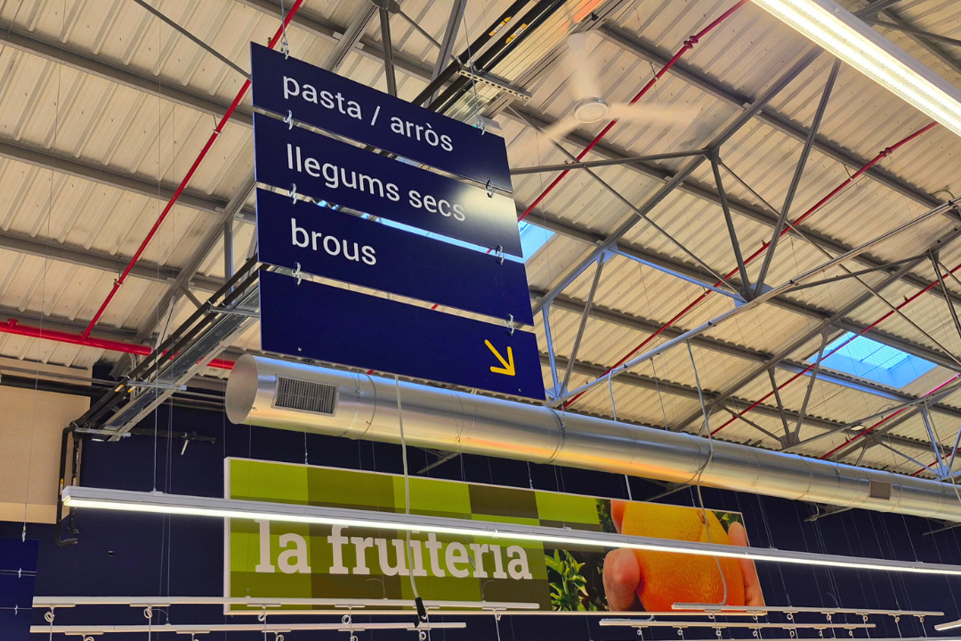 Para el nuevo supermercado de Grup Bon Preu – Esclat en Mollerussa, ejecutado entre octubre y diciembre de 2025 e inaugurado el 4 de diciembre de 2025, el equipo de Rull Services diseñó y llevó a cabo una solución integral de señalización totalmente a medida. El trabajo se basó en el manual corporativo de imagen del cliente y se desarrolló tras varias reuniones de coordinación con la propiedad y el equipo de ingeniería. Cada elemento gráfico fue personalizado e integrado cuidadosamente, adaptándose a las características específicas del espacio y a los flujos de circulación del centro.